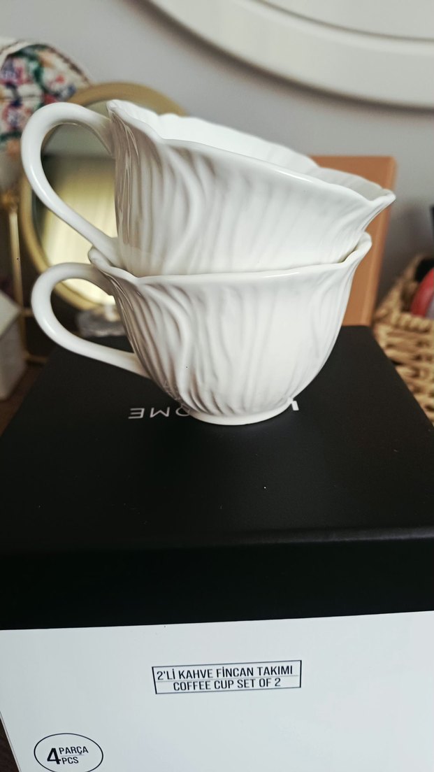 Kabartmalı desene sahip, kulplu 2'li beyaz kahve fincan takımı. ☕ Sıfır kutulu ürün.