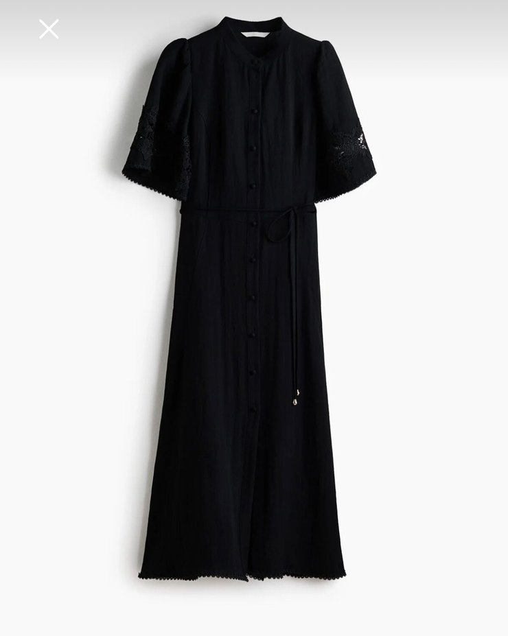 L beden Krinkle dokuma kumaştan, bant yakalı, önü kaplı düğmeli, belinde boncuk uçlu ince kuşaklı uzun elbise. Nakış işlemeli detayları bulunan dirsek boyu geniş kabarık kollu. Önü ve arkası prenses dikişli, hafif kloş etekli. Kol ağızları ve etek ucu zarif piko şeritli. Astarsız. Article Description Siyah Düz renkli