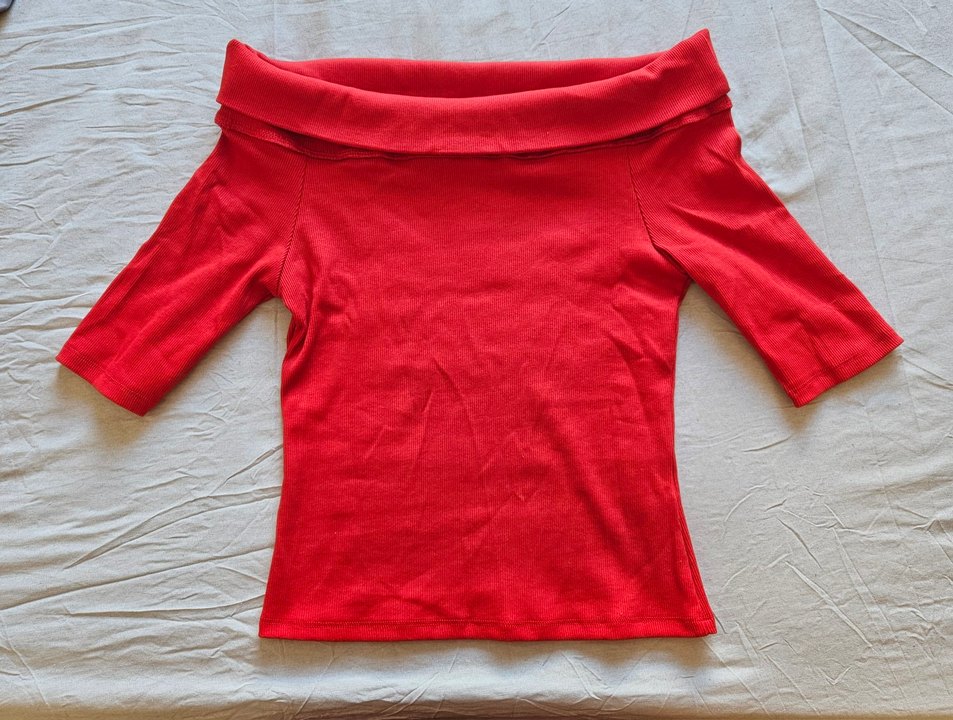 Yeni ve etiketi üzerinde, H&M S beden, kırmızı, yarım kollu omuzları açık bluz.