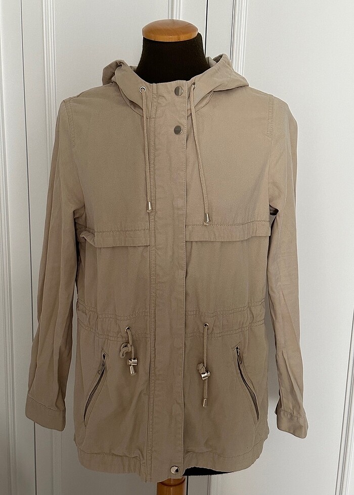 H&M pamuklu kısa trençkot parka. Gold fermuar ve çıtçıt kapatmalı, astarsız kapişonlu model . 40 beden fakat dar kesim 38 bedene olur. Bir kez denendi . Bedeni uymadığı için satışta. Yepyeni durumda