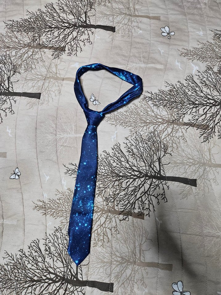 Parlak mavi yüzeye sahip erkek kravat, hafif yıldız desenleriyle..