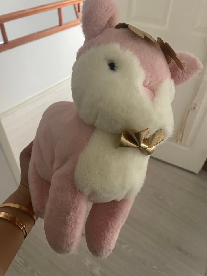 Yumuşak dokulu pastel pembe peluş kedi oyuncağı, beyaz yüzü ve boynunda küçük altın renkli fiyonk ile.