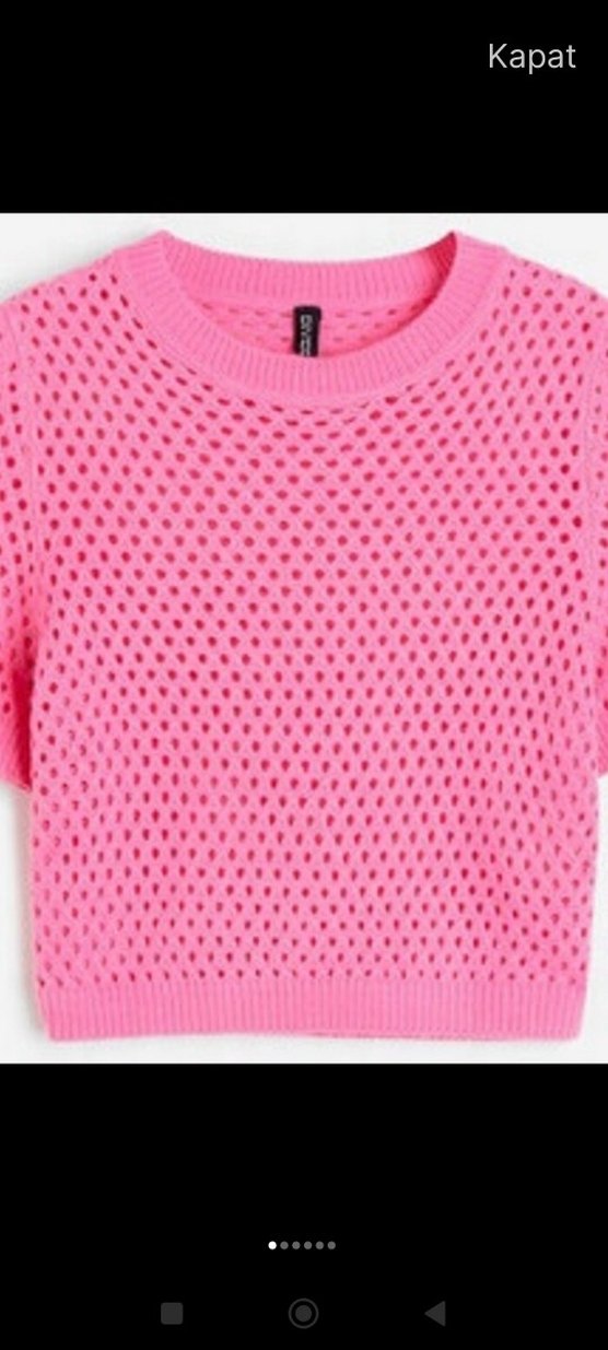 Pembe, kısa kollu, yuvarlak yaka ve nefes alabilen örgü desene sahip, vücuda oturan kadın kazak. Pastel rengiyle günlük sokak stiline uygundur.