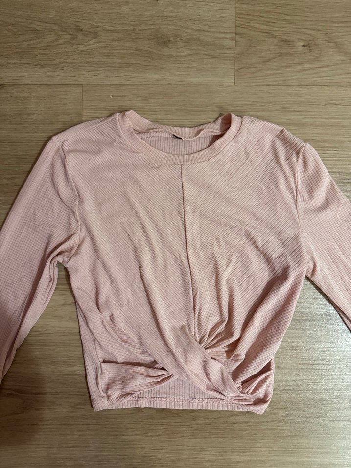 Pembe renkli, uzun kollu ve bisiklet yaka kadın tişörtü, yumuşak kumaştan üretilmiştir. Rahat ve şık sokak stili için uygundur.