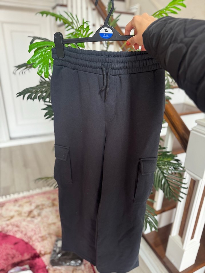 Siyah renkli, bol kesim kargo pantolonu. Yumuşak ve sıcak kumaştan, kemerli ve rahat sokak stili için uygun.