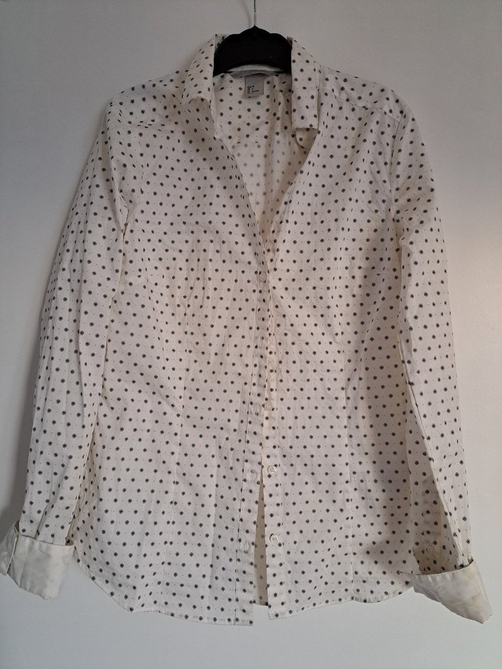 Elasten kumaştan, gri puantiyeli beyaz kadın gömleği. Uzun kollu, düğmeli ve normal kesim. Ofis için uygun S beden Ayrıntılar fotolarda var #hm #h&m #gömlek #hmgömlek #ofis