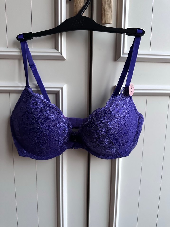 Sıfır ürün etiketli. Push Up destekli ürün.Mor renk dantel detaylı, göğüs ortası taşlı şık bir sütyen