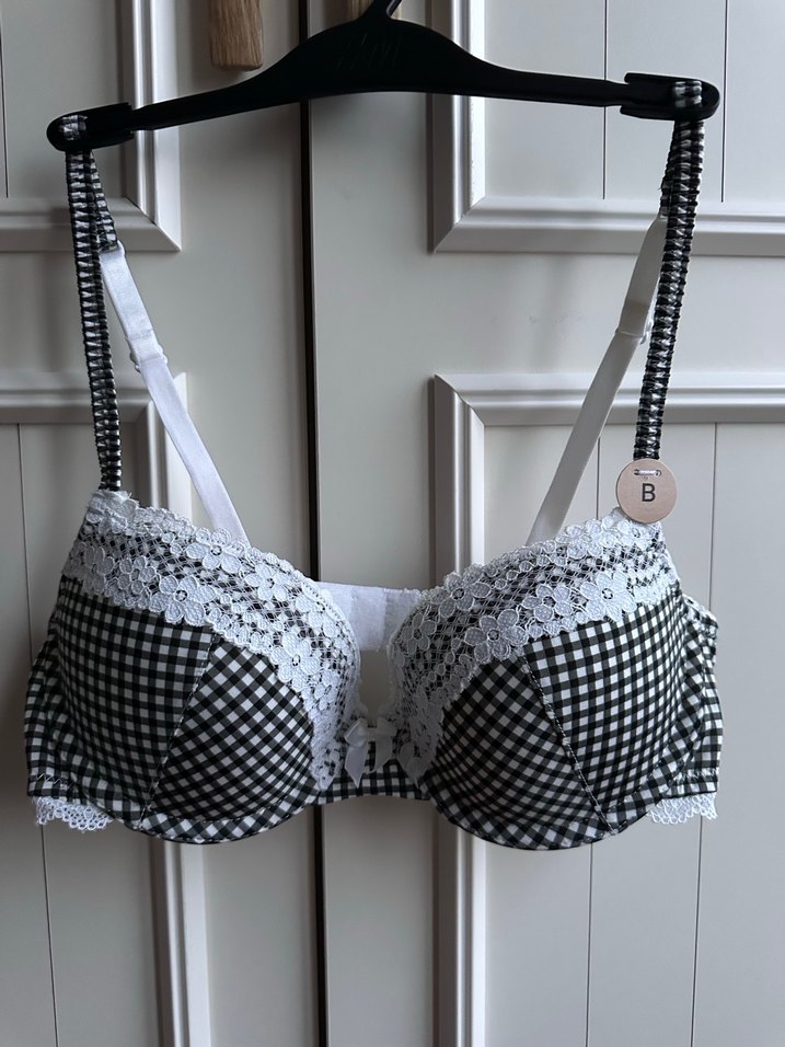 Sıfır etiketli ürün. siyah beyaz renklerde ekose desenli, dantel detaylara sahip,ped destekleri çıkabiliyor.