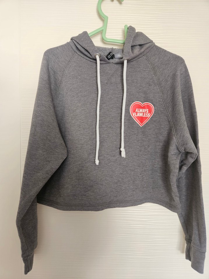 H&M S beden Gri renkte, uzun kollu, kapüşonlu ve triko dokulu kadın sweatshirt. Bol kesim ve normal boyda, kalp şeklinde 'Always Flawless' baskılı detay içerir.