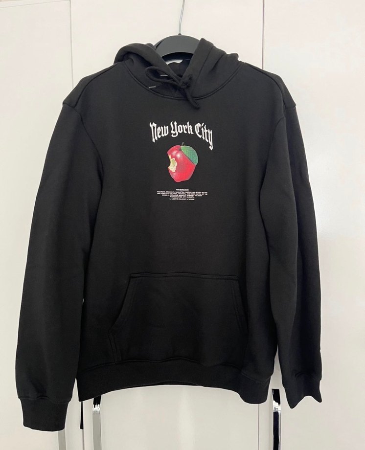 Siyah, bol kesim, bisiklet yaka ve uzun kollu sweatshirt. New York City baskısı ve ön cep bulunur. Günlük rahat kullanım için uygundur. Ürün 2 kere giyildi temiz. Koltuk altı eni: 55 cm boy:65 cm