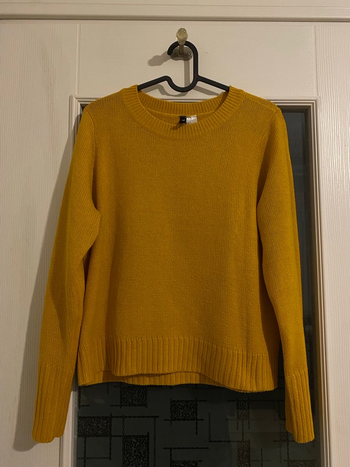 Hardal triko, yuvarlak yaka ve uzun kollu kadın kazak. S beden.