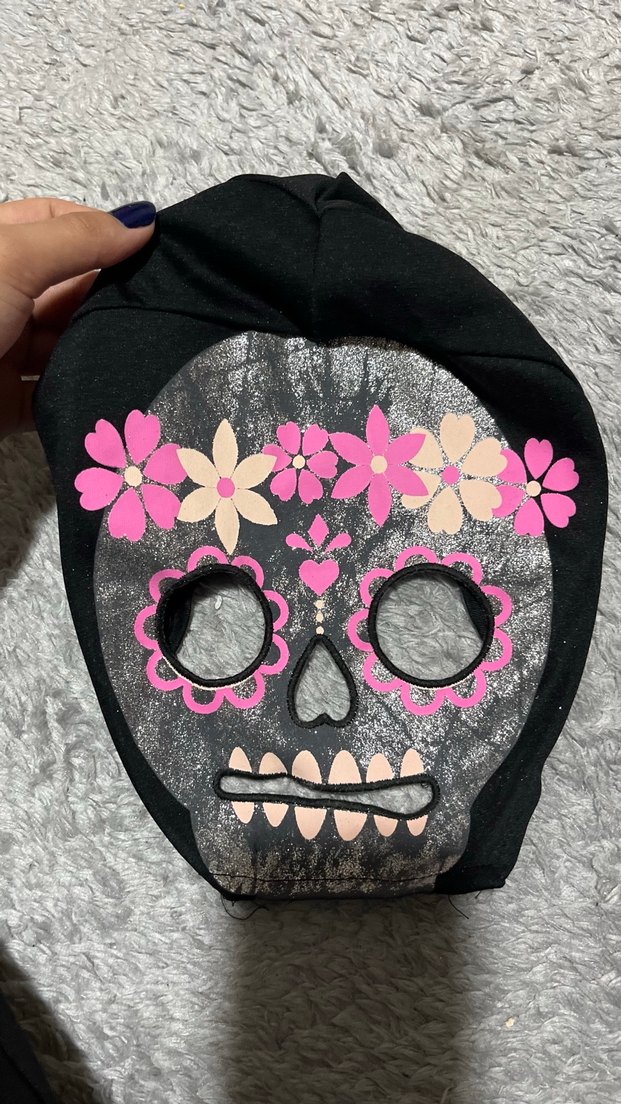 Göz ve ağız delikli, pembe ve bej çiçeklerle süslenmiş siyah kuru kafa desenli maske. Ürün H&M marka ve çocuklar için ama büyüklere de oluyor yüzü küçükse