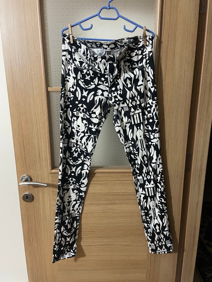 Siyah beyaz zebra desenli, dar kesim, midi boy kadın kumaş pantolon, sentetik kumaştan, günlük kullanım için uygundur.