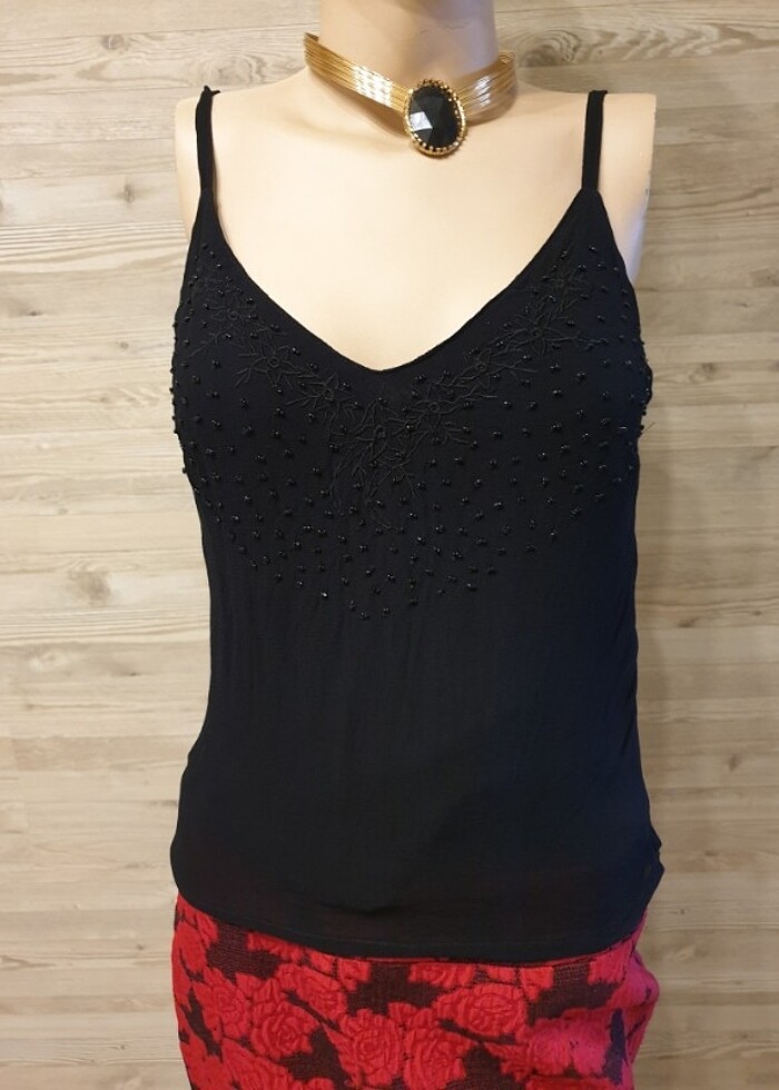 H&M Siyah önü boncuklu askılı bluz,az ve temiz kullanıldı temizlendi paketlendi içiniz rahat hemen giyebilirsiniz,yandan fermuar kapama,astarlı,100% polyester, - Göğüs çevresi koltuk altından: 84 cm. -Bel çevresi: 73 cm. - Boy omuzdan aşağı: 52 cm.