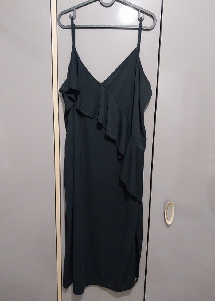 1 kez düğünde giyildi. Sol kalca altından yırtmaçlı, askı ayarlı, diz altı abiye, oversize ürün 46-48 bedene kadar olur