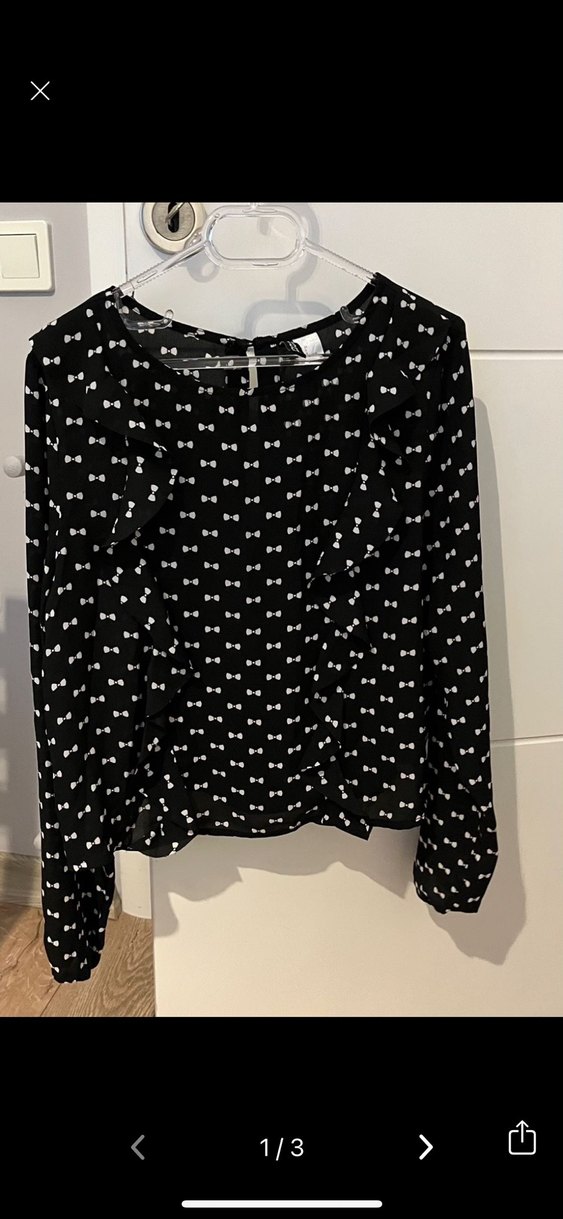 Siyah, uzun kollu,kolları fırfır detaylı ve fiyonk desenli bol kesim bluz. Yumuşak sentetik kumaştan günlük kullanım için uygundur. 34 beden ama 36 bedene de olur.