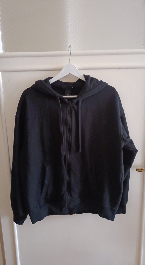 H&M Yumuşak ve sıcak kumaştan, kapüşonlu ve fermuarlı siyah sweatshirt. Bol kesim, uzun kollu ve günlük sokak stili için uygun. S beden.