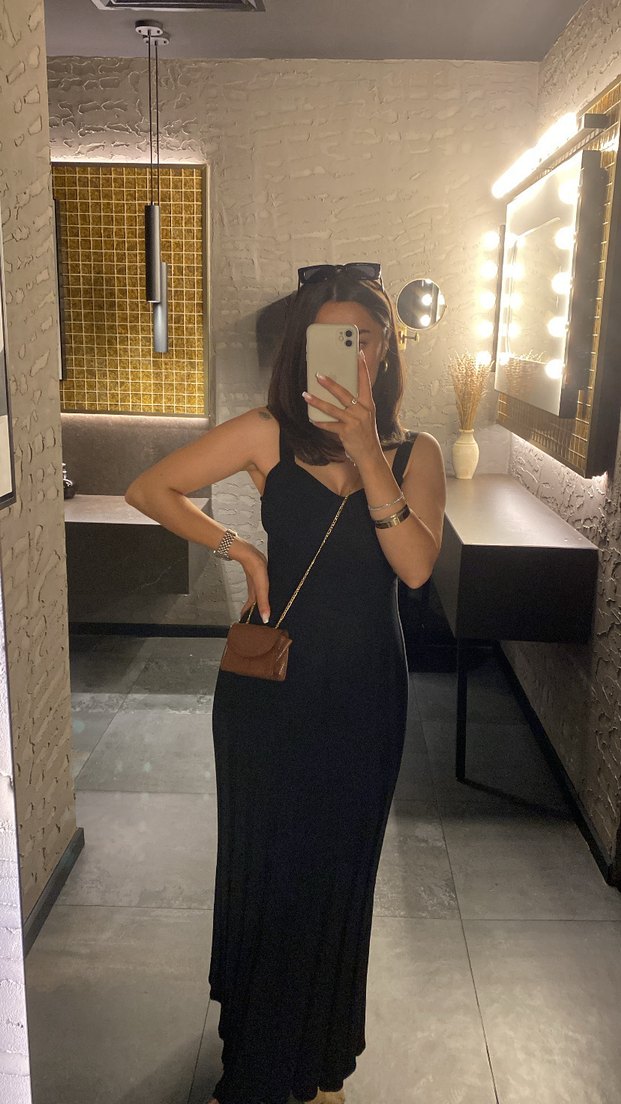 siyah ve ince askılı, vücuda oturan midi elbise. İnce triko bu elbise hem gündüz hem gece için zahmetsiz şıklık sunar.