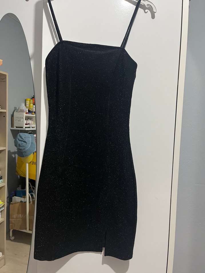H&M Siyah Simli Askılı Mini Abiye Elbise