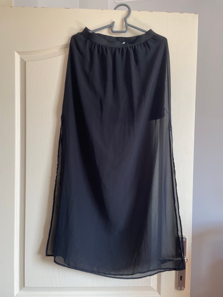 Yumuşak sentetik kumaştan, dökümlü ve bol kesim siyah uzun kadın eteği, minimalist gotik tarz için uygundur.