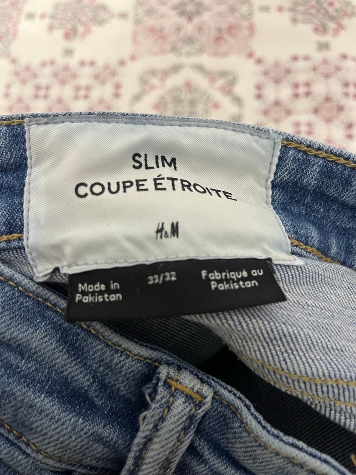 H&M markalı, mavi denim erkek jean. Slim fit, fermuarlı , günlük kullanıma uygun. Kilodan kaynaklı satılık bir iki kez giyildi 33/32