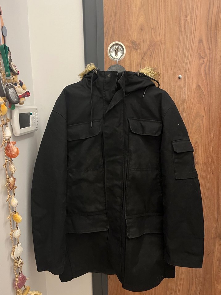 Siyah renk, kapüşonlu, kürklü detaylı ve cep detaylı erkek mont. Rahat kesim, uzun kollu ve dış mekan kullanımı için uygundur.