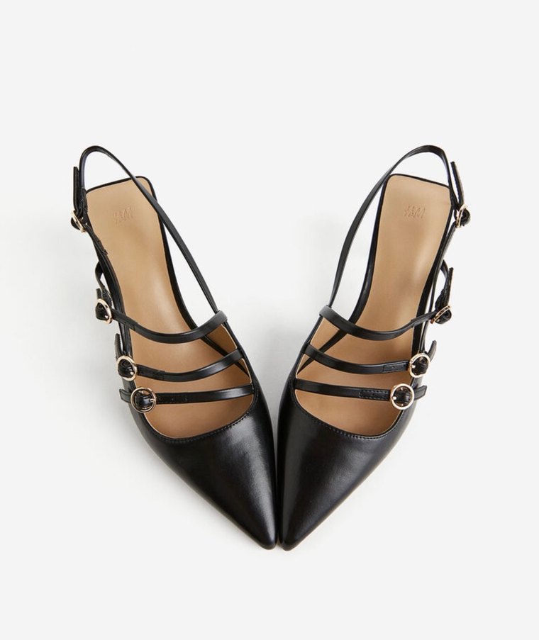 Siyah deri stiletto topuklu, üç tokalı kayışlı, sivri burunlu ve şık goth tarzında, ofis kullanımı için uygun.