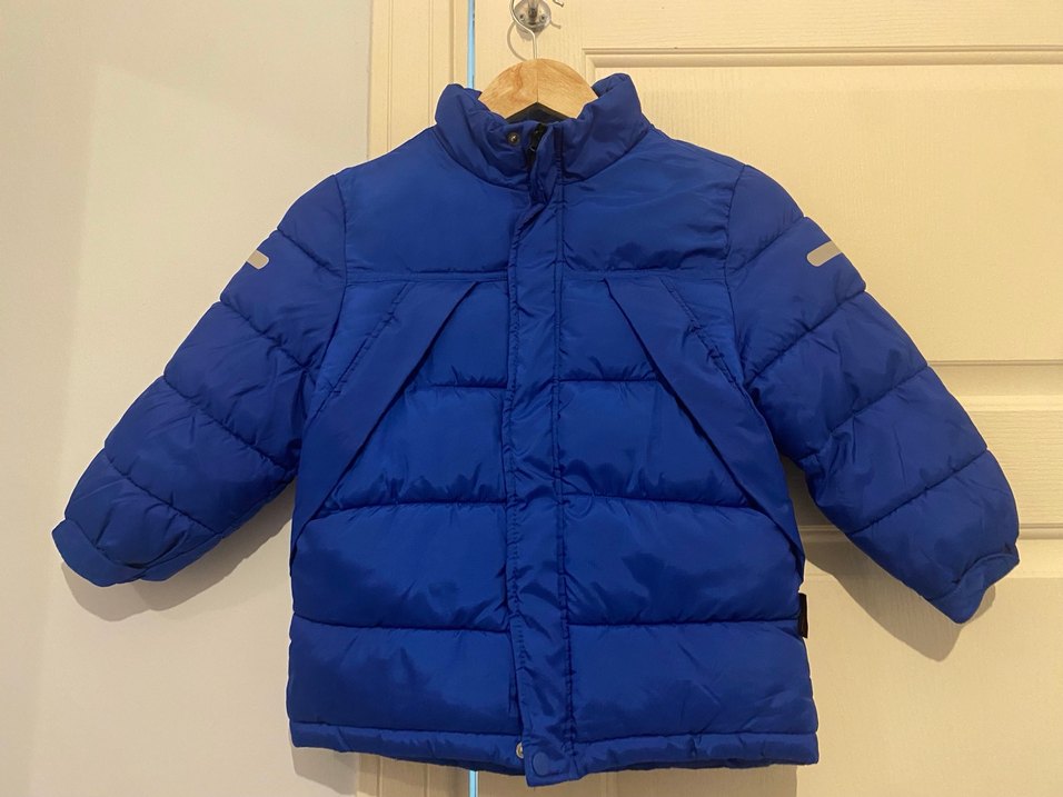 4-5 yaş etiketli. Çocuğun gelişimine göre daha küçükken veya daha büyükken de giydirilebilir. Düğmeli ön kısmı ve kesik yakasıyla, koyu mavi renkli, düz ve basic tarzda erkek çocuk montu. Yumuşak ve sıcak kumaştan üretilmiştir. Su geçirmez, çok az giyilmiştir.