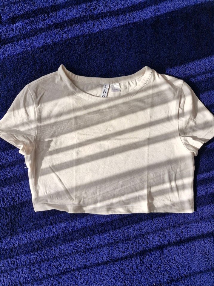 Baya kısa crop tişört beyaz. M beden Artık tarzıma uymuyor, o yüzden satıyorum. %95 Pamuklu, %5 elastan