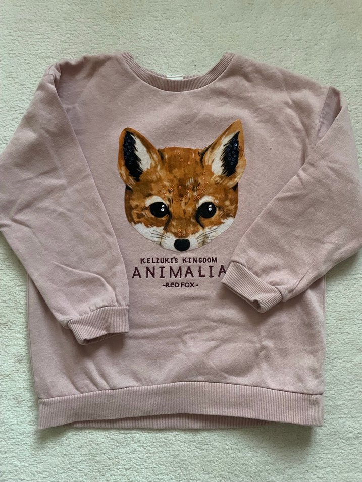 Bej renkte, uzun kollu, bisiklet yaka kız sweatshirtü. Yumuşak sentetik kumaştan, bol kesim. Kürklü tilki baskısı ile dikkat çeker.