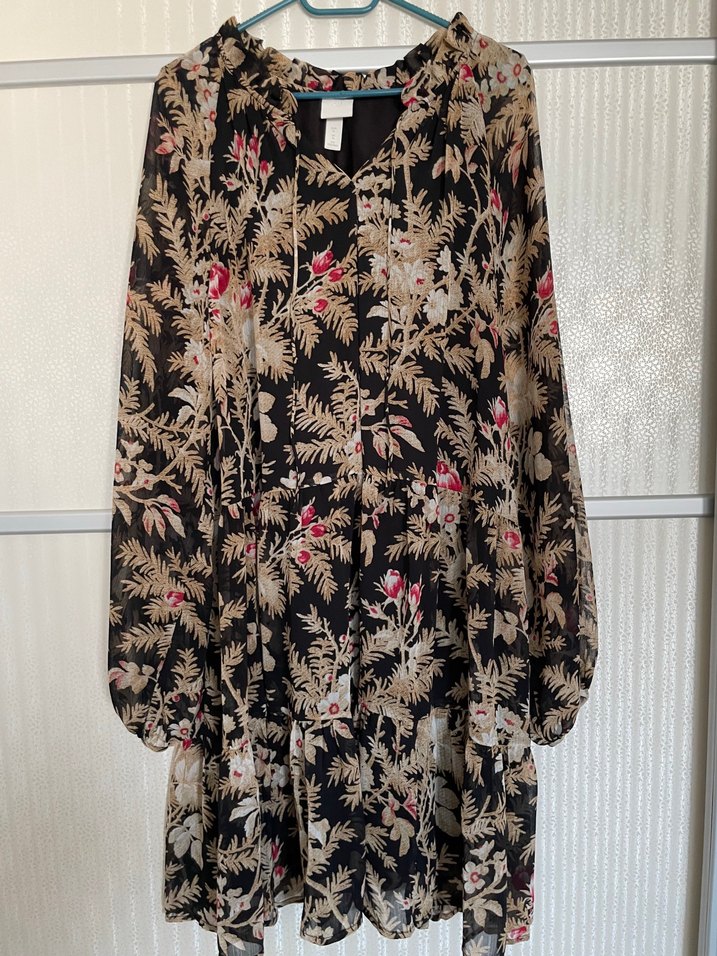 Hamileler için de uygun, geniş kesim. Kullanıldı ancak defosu yok. Bohem tarzda, uzun kollu, bol kesim hamile tuniği. Koyu desenli sentetik kumaş, drapeli ve V yakalı, romantik akşamlar için uygun.