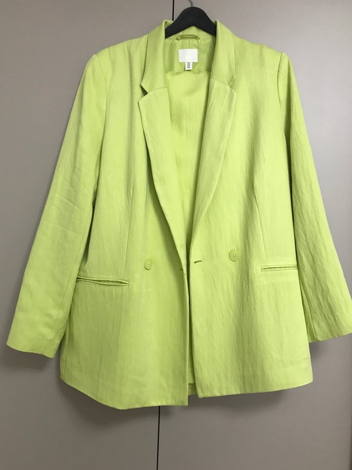 Düğmeli önü, keten kumaşı ve yeşil rengiyle normal boy midi kesim, minimal tasarımlı kadın blazer. Ofis kullanımı için uygun, uzun kollu ve rahat kesim.