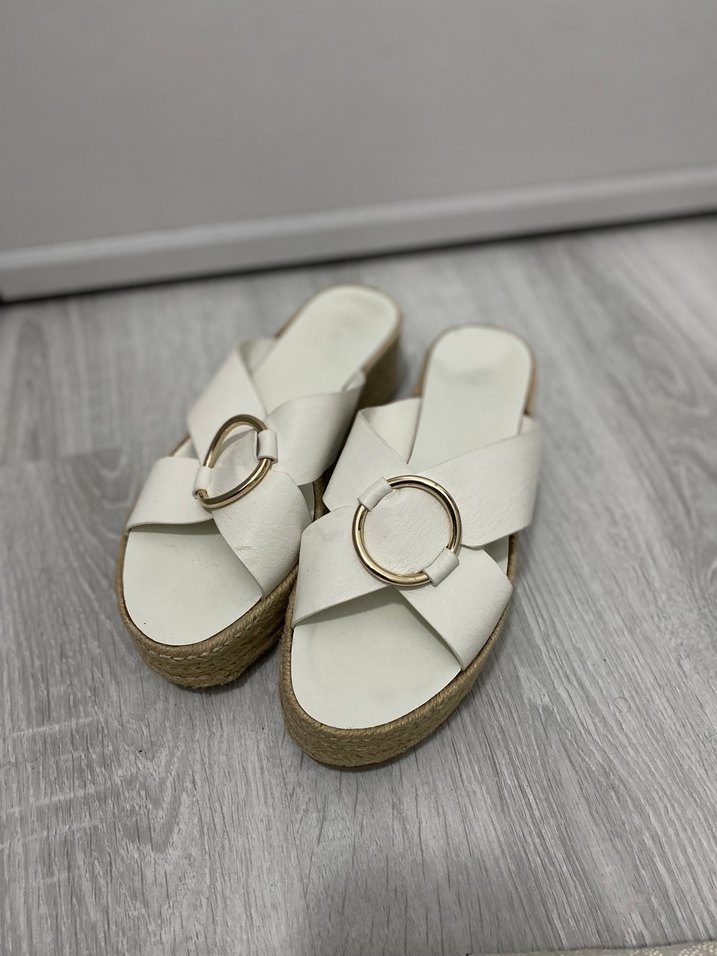 Beyaz renk, tokalı bantlı, dolgulu topuklu kadın terlik. Minimalist ve bohem tarzda, günlük kullanıma uygun.