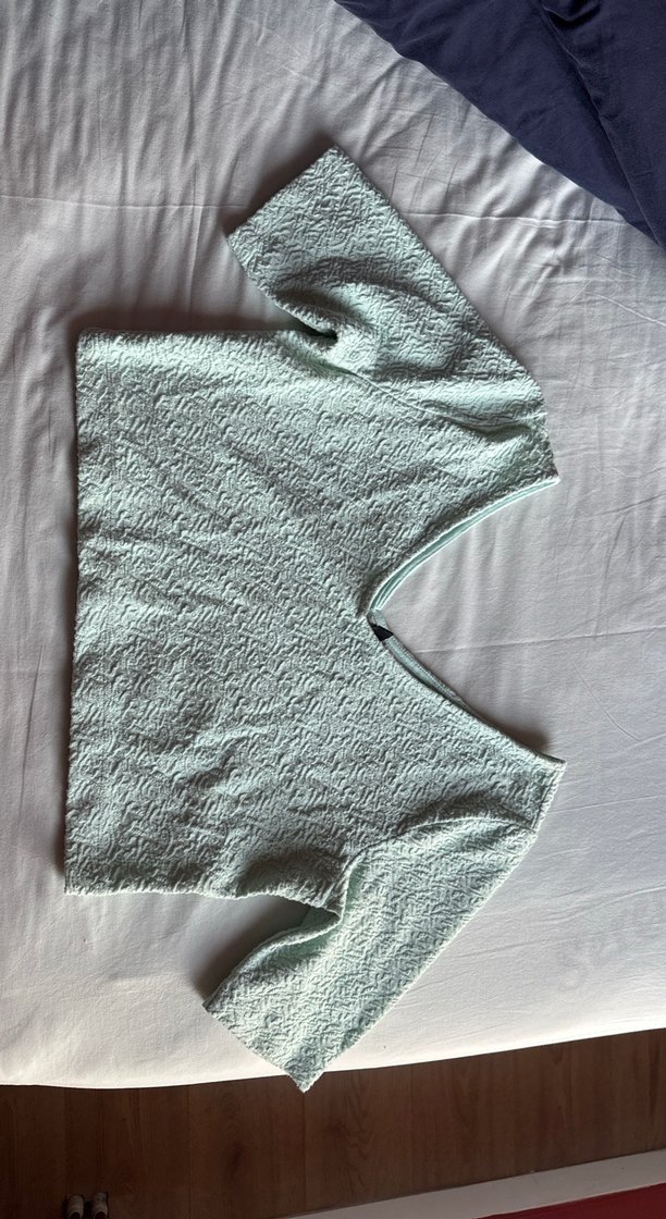 Turkuaz renkli, V yakalı ve kısa kollu bu dar kesim bluz, dokulu sentetik kumaştan ve dantel detaylıdır. Günlük kullanım için uygundur.