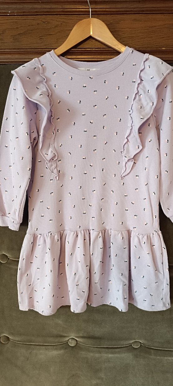 Pastel pembe renkli, uzun kollu, bol kesim kız elbisesidir. Nakışlı desenlere ve fırfır detaylara sahiptir, pamuklu yumuşak kumaştandır. Temiz sorunsuz.