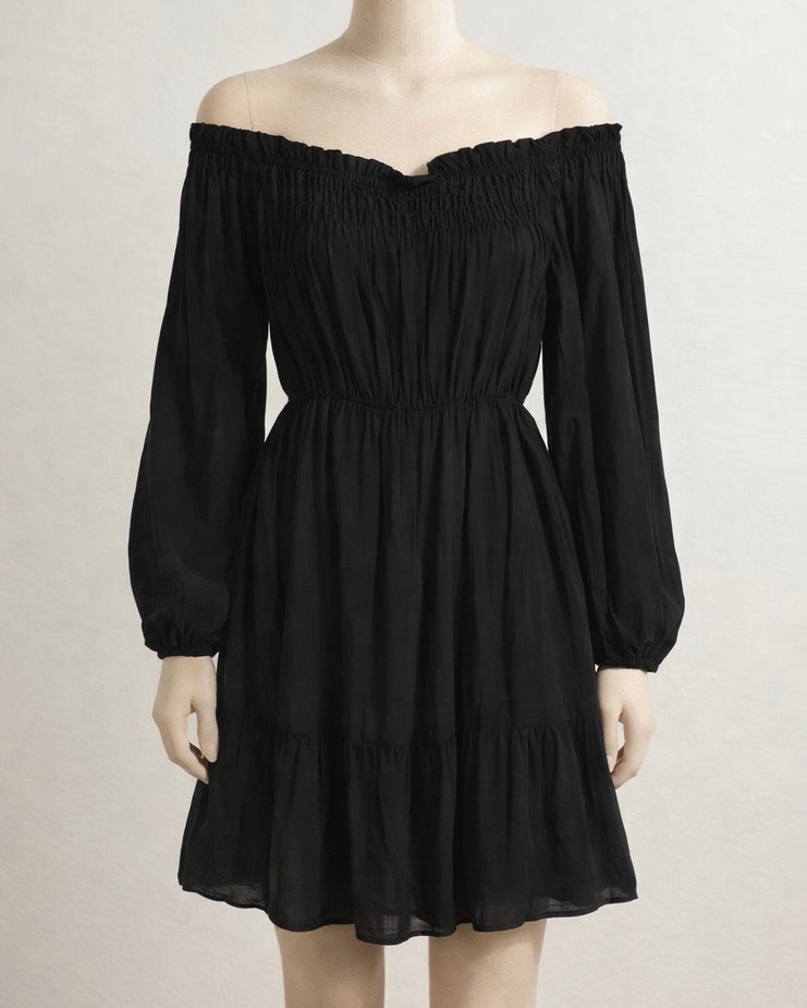 Siyah midi boy elbise, kayık yaka ve uzun kollu, nefes alabilen keten kumaştan, bol kesim ve fırfır detaylı. Giyilmedi.
