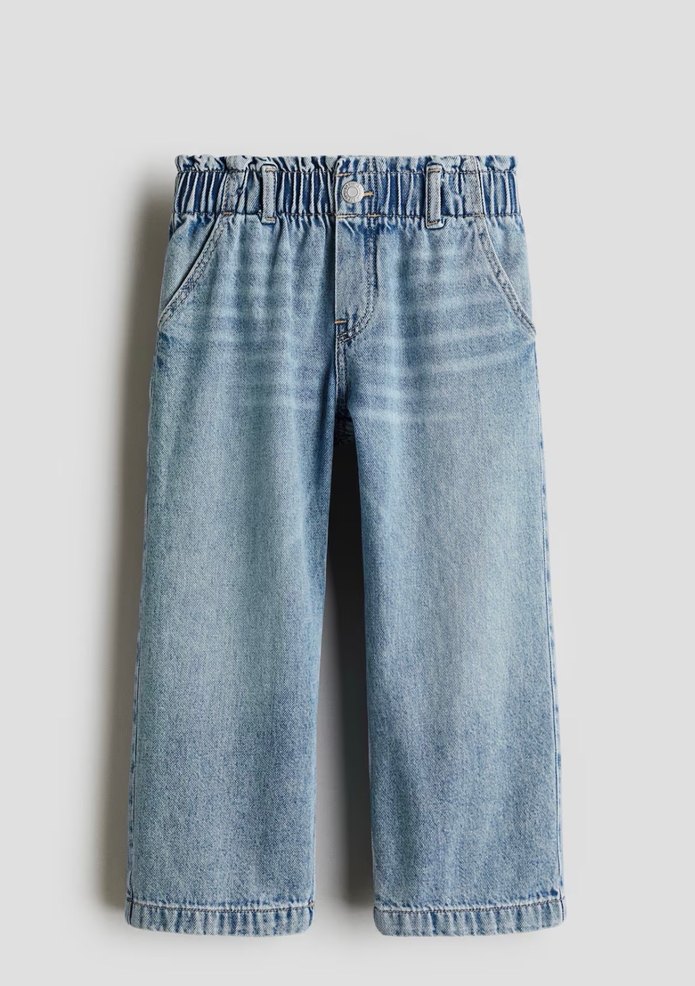 mavi tonlarında, beli lastikli ve kemerli, normal boyda rahat kesim denim pantolon.