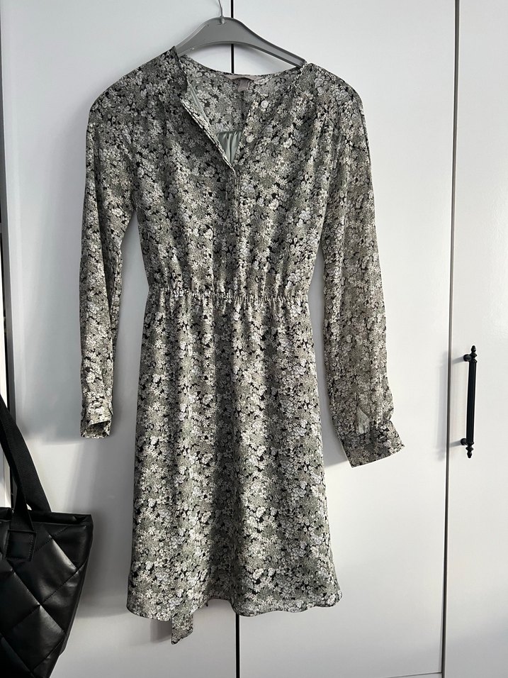 s beden için uygun yeni gibi. şifon kumaş astarlı. Yeşil renkli, uzun kollu, V yakalı midi elbise, yumuşak sentetik kumaştan ve hafif çiçek deseniyle. Dantel detaylı ve rahat kesim, ofis için uygundur.