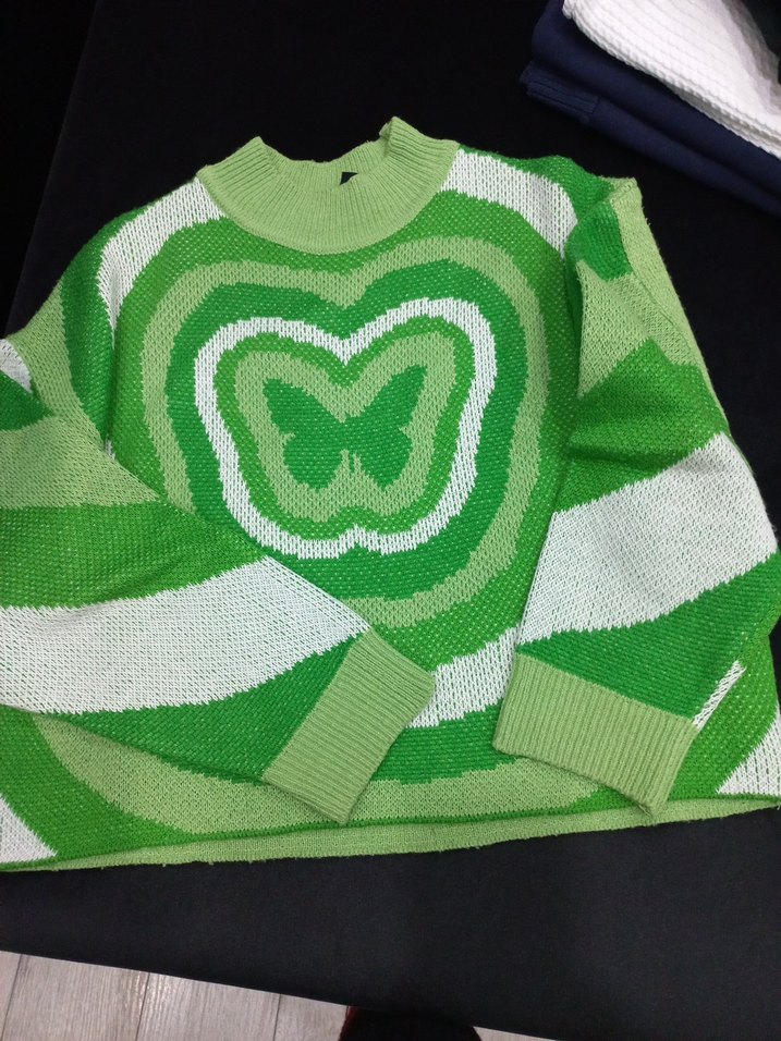 Örgü kadın kazak, uzun kollu ve yuvarlak yakalıdır. Salaş kesimi, renkli yeşil tie-dye desen ve kelebek motifiyle bohem ve retro tarzını yansıtır. Normal uzunlukta, günlük ve rahat kullanıma uygundur. Bikaç yerinde ip çekmesi ve azda olsa tülerme vardır almadan önce sorun lütfen iade yoktur..