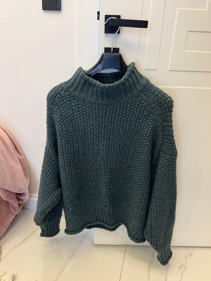 yeşil renkte, örgü kumaştan yapılmış boğazlı ve uzun kollu, rahat kesim kadın kazak. Günlük kullanıma uygun. xl beden
