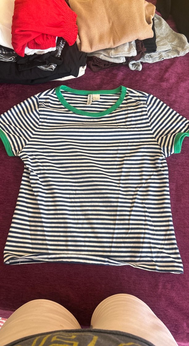 H&M Yeşil Yakalı Çizgili Pamuklu Tişört