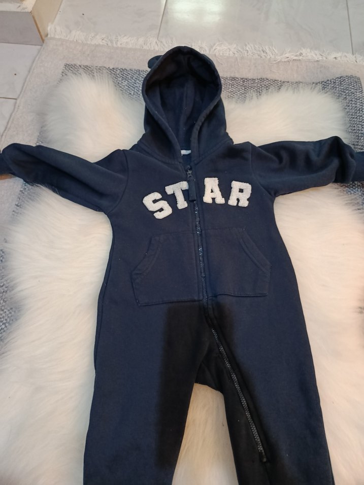 Koyu gri renkte, kapüşonlu ve önünde "STAR" yazısı bulunan erkek bebek tulumu. Yumuşak kumaş, tam fermuar ve kürk detaylı kapüşon içerir.