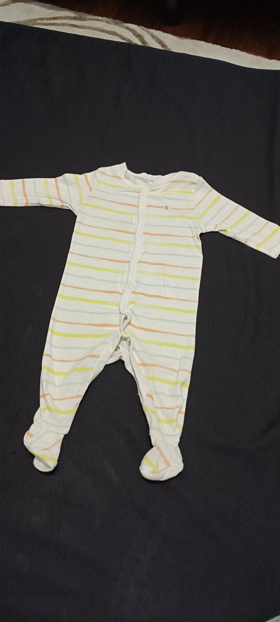 Uzun kollu ve bisiklet yakalı bu bebek tulumu, yumuşak ve sıcak kumaştan yapılmıştır. Renkli çizgiler ve kolay giydirme için düğmeler vardır.