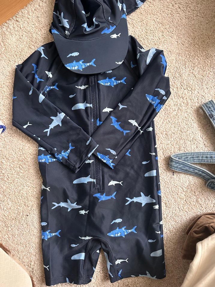 Uzun kollu, koyu mavi renkli, köpekbalığı desenli erkek çocuk mayo ve uyumlu şapka, yüzme için tam koruma sağlar.