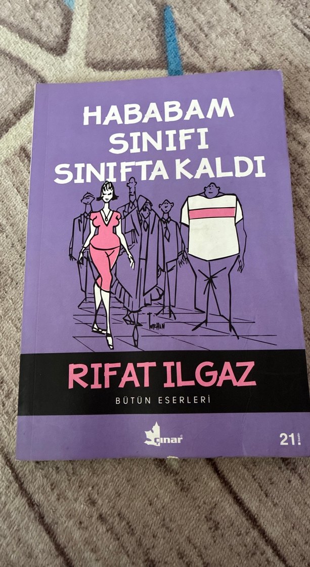 Rıfat Ilgaz'ın 'Hababam Sınıfı Sınıfta Kaldı' adlı mizah kitabı, mor kapak ve çizimli karakterler içerir. Bütün eserler serisindendir. Çok nem almış. Okunur