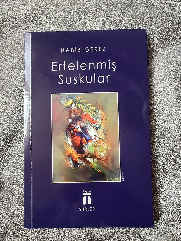 Habib Gerez'in "Ertelenmiş Suskular" adlı şiir kitabı, renkli soyut kapak görseli ile şiirlerden oluşmaktadır.