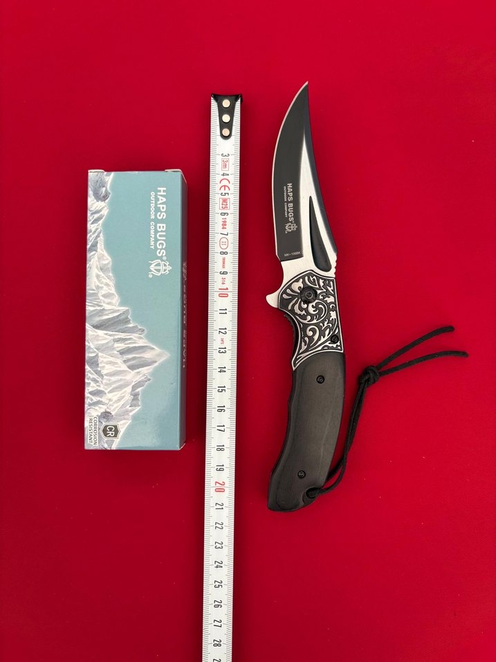 Siyah katlanır bıçak, desenli sap ve keskin bıçağa sahiptir. Bileklik ipi ve yaklaşık 21 cm uzunluğundadır. Üzerinde APSBUGS 1213 işareti bulunur.