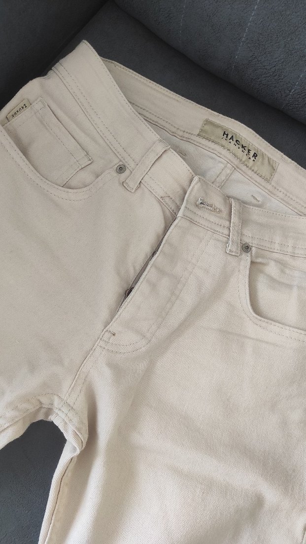 Bej renk, normal bel ve Jean kumaştan üretilmiş bu erkek kot pantolon, rahat ve şık bir sokak stili sunar. Normal boyda, boru paça ve desensiz tasarıma sahiptir, günlük kullanım için uygundur. Ürün az kullanılmış olup yeni ve temizdir. Bej rengi, 29/32 bedendir. Ölçüleri; belden boyu 100 cm, beli 40 cm, paça genişliği 16,5 cm'dir.