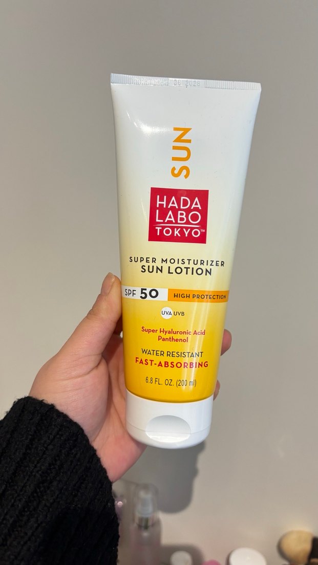 Hada Labo Tokyo SPF 50 güneş losyonu, süper hyaluronik asit ve panthenol içerir. Suya dayanıklı ve hızlı emilir. ☀️