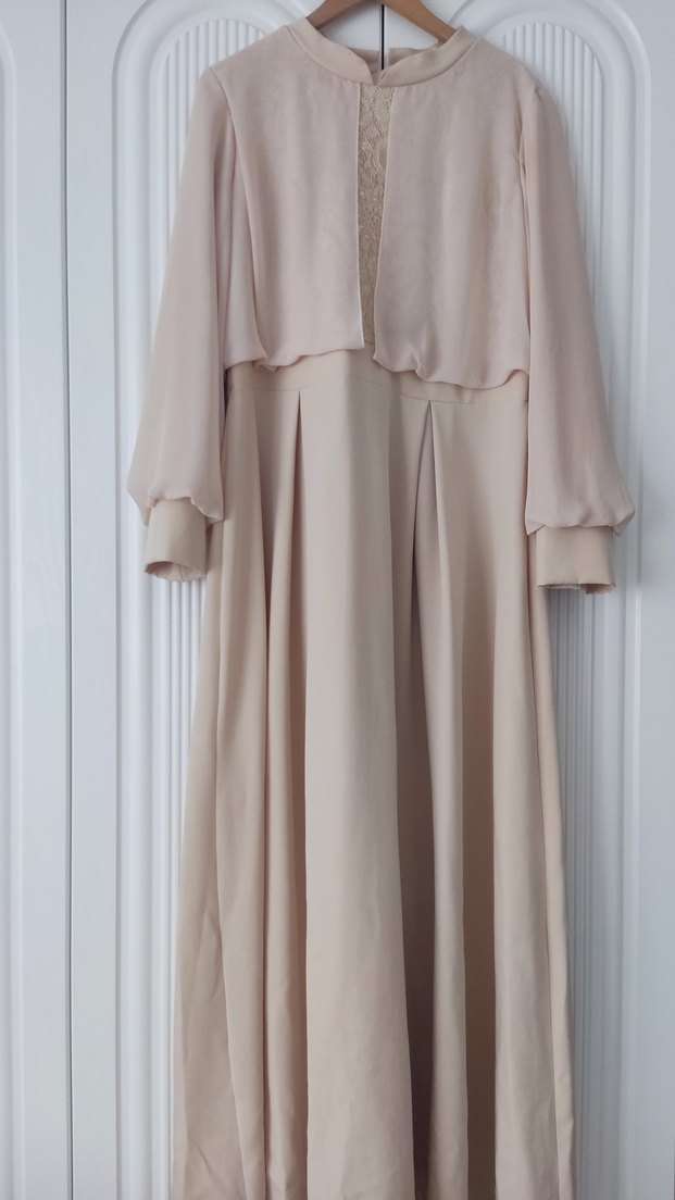 Pudra renkte, dökümlü ve bol kesim uzun elbise. İpek gibi yumuşak kumaştan, uzun kollu ve yüksek yakalı, düğünler için uygun.